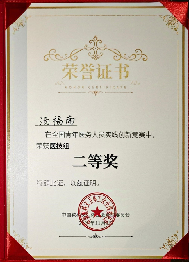 11月9日,全國青年醫(yī)務(wù)人員實(shí)踐創(chuàng)新競賽決賽在浙江杭州舉辦。本次大賽由中國教科文衛(wèi)體工會主辦,浙江省教育工會、浙江大學(xué)工會、浙江大學(xué)醫(yī)學(xué)院承辦。我校第一附屬醫(yī)院臨床醫(yī)學(xué)工程處青年工程師湯福南榮獲二等獎。