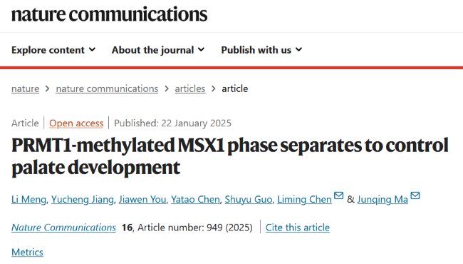 2025年1月22日,口腔疾病研究與防治國家級(jí)重點(diǎn)實(shí)驗(yàn)室培育建設(shè)點(diǎn)、我校附屬口腔醫(yī)院正畸科馬俊青教授團(tuán)隊(duì)在高水平期刊Nature Communications(《自然通訊》)上發(fā)表了題為“PRMT1-methylated MSX1 phase separates to control palate development”(PRMT1甲基化調(diào)控的MSX1相分離影響腭發(fā)育)的文章。該研究首次發(fā)現(xiàn)MSX1經(jīng)歷PRMT1精氨酸甲基化所調(diào)控的液-膠相分離行為,并揭示了MSX1異常相分離在腭部發(fā)育中的作用與機(jī)制,為非綜合征型唇腭裂的預(yù)防和治療提供了新思路。