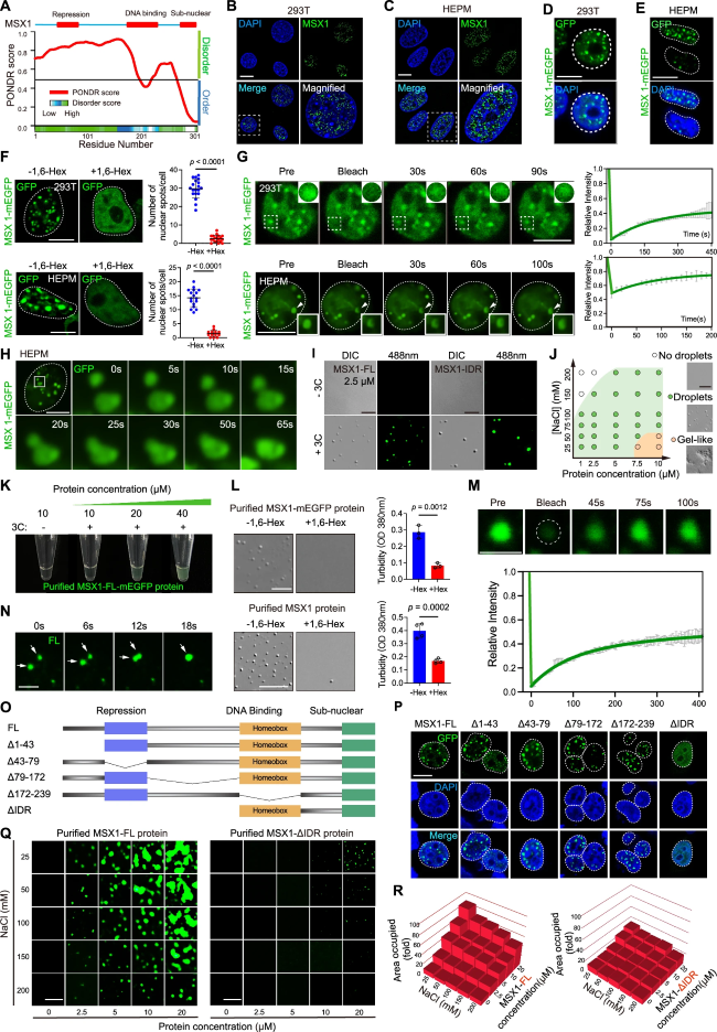 關(guān)于顱頜面發(fā)育障礙中相分離的調(diào)節(jié)和功能知之甚少。其中Msh同源框基因1(MSX1)和蛋白精氨酸甲基轉(zhuǎn)移酶1(PRMT1)是兩個(gè)重要的調(diào)節(jié)因子。MSX1突變與人類最常見的顱面出生缺陷-腭裂有關(guān)。該研究首次發(fā)現(xiàn),由PRMT1催化的甲基化調(diào)控的MSX1相分離是胚胎腭間充質(zhì)干細(xì)胞(EPMs)功能和腭融合的脊椎動(dòng)物保守調(diào)控機(jī)制。