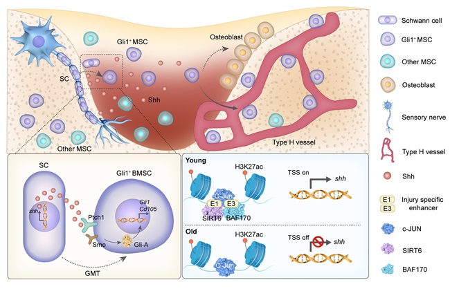 本研究中,團隊應用單細胞轉錄組測序結合多種譜系示蹤小鼠,發現骨損傷早期修復過程中Plp1+SCs能夠轉分化為Gli1+BMSCs,從而發生GMT。機制上,c-JUN/SIRT6/BAF170 通過激活損傷響應性增強子,快速啟動Shh 轉錄及其信號轉導調控,促進SCs轉化為Gli1+BMSCs,一方面促進成骨分化;另一方面耦合H型血管生成并重構血管微環境,進而促進骨損傷修復。本研究還證實衰老引起的頜骨損傷修復障礙與GMT不足相關,并在Plp1-Sirt6fl/fl條件敲基因小鼠模型中得到了驗證。本研究不僅豐富了骨再生修復理論,對認識衰老和疾病狀態下頜骨損傷修復障礙具有重要意義,而且從神經血管微環境角度為促進骨修復提供新思路。