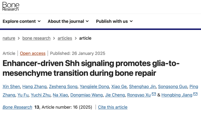 1月26日,口腔疾病研究與防治國家級重點實驗室培育建設點、我校附屬口腔醫院江宏兵教授團隊在高水平期刊Bone Resrarch(《骨研究》)上發表了題為“Enhancer-driven Shh signaling promotes glia-to-mesenchyme transition during bone repair”(增強子驅動的Shh信號促進骨損傷修復過程中神經膠質-間充質轉化)的文章。該研究首次發現頜骨損傷修復過程中的神經膠質-間充質轉化(GMT)現象,從神經膠質細胞(SCs)轉化引導骨再生這一嶄新視角,聚焦SCs 轉化及其耦合成骨與成血管機制,深入分析增強子驅動的Shh信號促進SCs 轉化為Gli1+間充質基質細胞(Gli1+BMSCs)及H 型血管生成在頜骨損傷修復中的作用。