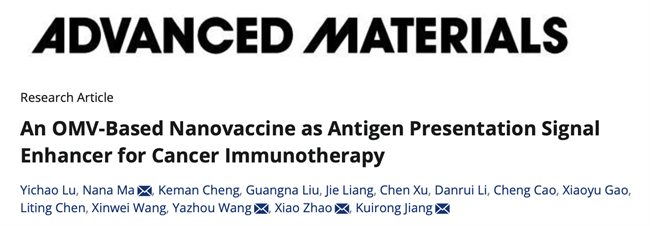 近日,我校第一附屬醫院胰腺中心蔣奎榮教授團隊與國家納米科學中心趙瀟研究員團隊合作,取得重要科研突破。雙方共同開發了一種基于細菌來源納米囊泡的抗原呈遞信號增強型腫瘤疫苗,為癌癥免疫治療提供了新思路。該研究成果以題為《基于細菌外膜囊泡的抗原呈遞信號增強型腫瘤疫苗》(《An OMV-Based Nanovaccine as Antigen Presentation Signal Enhancer for Cancer Immunotherapy》)的論文,發表于國際期刊《先進材料》(Advanced Materials,影響因子:27.4)。