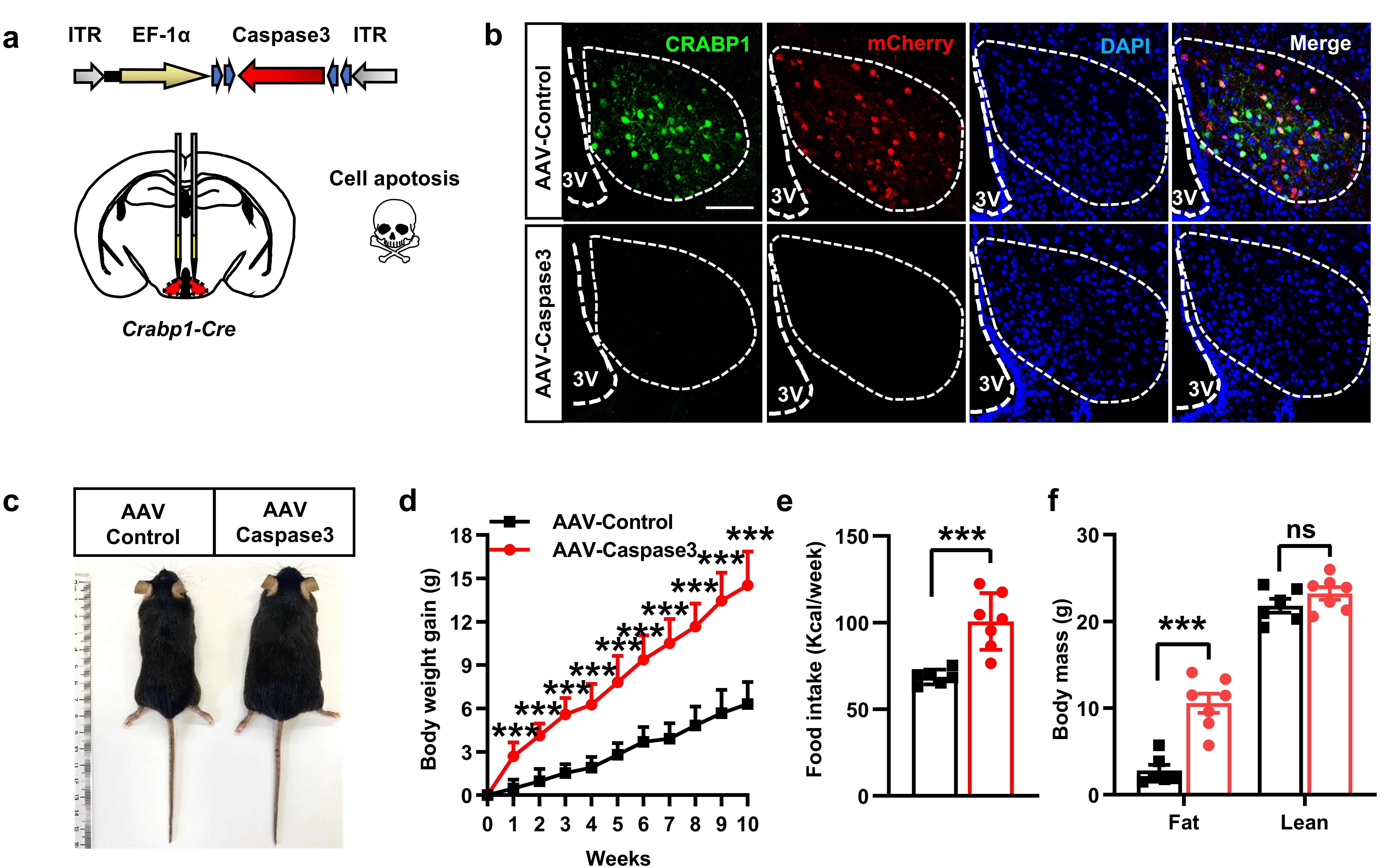 團隊首先發現CRABP1蛋白特異性地表達于成年小鼠的下丘腦弓狀核(ARC)區域。進一步通過與ARC中已知的各神經元類群標志分子進行免疫染色和原位雜交,發現表達CRABP1的細胞是一類不同于AgRP神經元和POMC神經元等已知類群的新型神經元亞群。通過構建CRABP1-Cre小鼠,并在ARC區域注射AAV病毒,以特異性消融ARCCRABP1神經元,結果導致小鼠出現肥胖等代謝失調相關表型。進一步利用化學遺傳學和光遺傳學技術,作者發現,特異性抑制ARCCRABP1神經元會導致小鼠攝食量增加,而激活這些神經元則顯著減少攝食行為。這一結果表明,ARCCRABP1神經元在調控食欲和能量平衡中發揮了重要作用。
