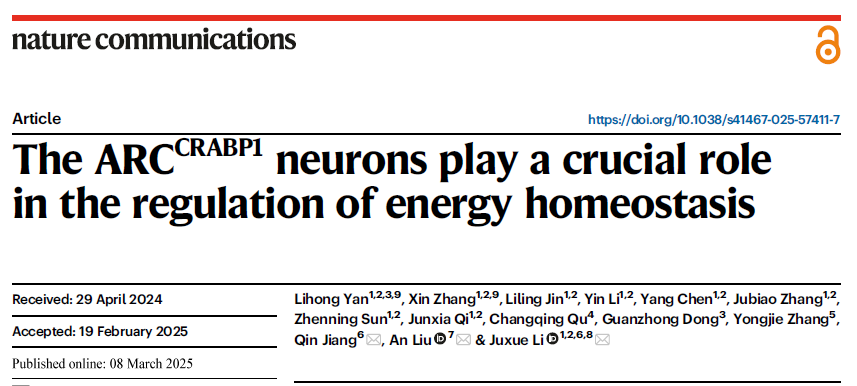 近日,基礎醫學院李聚學教授,附屬眼科醫院蔣沁教授聯合東南大學劉安副教授在《自然?通訊》在線發表題為《弓狀核CRABP1神經元在能量穩態調節中起著至關重要的作用》(The ARCCRABP1 neurons play a crucial role in the regulation of energy homeostasis)的研究論文。在這項研究中,研究團隊鑒定了下丘腦弓狀核(ARC)中一種新型的調節食欲的神經元—ARCCRABP1神經元。
