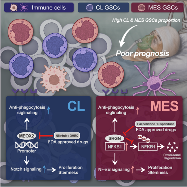 研究團隊通過對GBM患者的單細胞轉錄組、GSC轉錄組等多組學數據聯合分析,發現不同患者體內的GSC分子亞型占比存在差異,CL和MES亞型占比較高的GBM患者生存預后較差。進一步利用多組學聯合分析,篩選發現了CL亞型GSC特征靶點MEOX2和MES亞型GSC特征靶點SRGN。在CL亞型GSC中,MEOX2通過調節Notch信號通路維持GSC干性和CL亞型特征。在MES亞型GSC中,SRGN通過維持NFKB1蛋白穩定性進而調節NF-κB信號通路,最終維持GSC的干性和MES亞型特征。利用虛擬分子篩選聯合體內外實驗驗證,發現了靶向MEOX2和SRGN的FDA批準藥物尼洛替尼和帕利哌酮。最終通過異質性小鼠模型,驗證明確聯合靶向CL和MES亞型GSC能夠有效抑制腫瘤惡性進展。