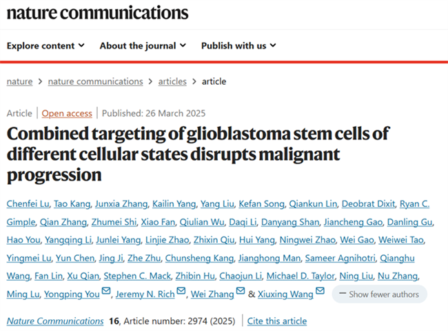 我校第一附屬醫院神經外科陸晨飛博士后,我校基礎醫學院康濤碩士,我校第一附屬醫院神經外科張軍霞教授,克利夫蘭醫學中心Kailin Yang博士,南京中醫藥大學醫學院劉陽副教授為本文的共同第一作者。我校基礎醫學院汪秀星教授,首都醫科大學附屬北京天壇醫院張偉教授,匹茲堡大學醫學中心Jeremy N. Rich教授,我校第一附屬醫院神經外科尤永平教授為本論文共同通訊作者。此工作得到國家高層次人才青年項目、國家自然科學基金、江蘇省自然科學基金、江蘇省特聘教授等項目資助。