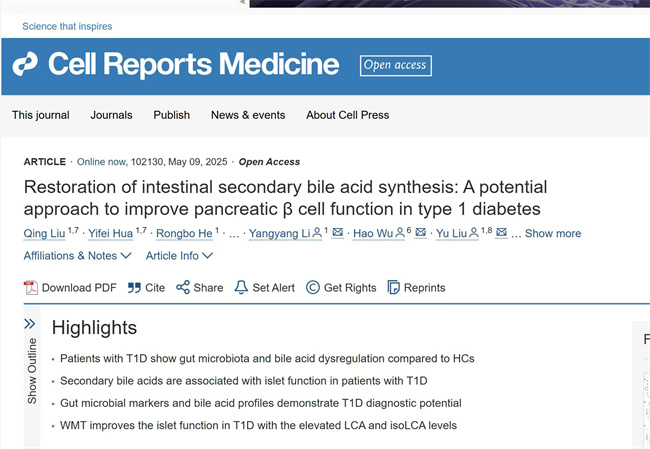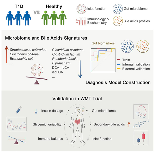 5月9日,國際期刊《Cell Reports Medicine》在線發表了我校附屬逸夫醫院劉煜教授團隊的重要研究成果Restoration of Intestinal Secondary Bile Acid Synthesis: A Potential Approach to Improve Pancreatic Beta-Cell Function in Type 1 Diabetes。該研究首次闡明了1型糖尿病(Type 1 diabetes,T1D)患者體內腸道菌群及次級膽汁酸代謝失調,并創新性發現次級膽汁酸合成的增強,特別是石膽酸(lithocholic acid, LCA)、異石膽酸(isolithocholic acid,isoLCA),與T1D患者洗滌菌群移植(washed microbiota transplantation,WMT)后胰島功能的改善有關。這一突破性進展不僅為解析T1D發病的腸-胰腺軸機制提供了新視角,更為基于微生物-代謝物調控的精準干預策略奠定了理論基礎。