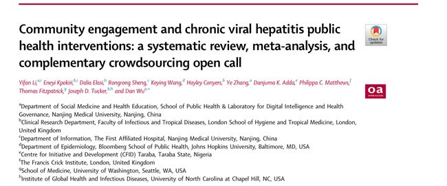 近日,我校公共衛生學院吳丹教授團隊聯合倫敦衛生與熱帶醫學院等研究團隊,在柳葉刀子刊《eClinicalMedicine》發表了題為《社群參與與慢性病毒性肝炎干預:系統評價、Meta分析及眾包征集證據整合》(Community engagement and chronic viral hepatitis public health interventions: a systematic review, meta-analysis, and complementary crowdsourcing open call)的研究論文。該研究開創性采用系統評價+眾包征集雙軌研究模式,為全球肝炎防控提供了可推廣的實踐范式。