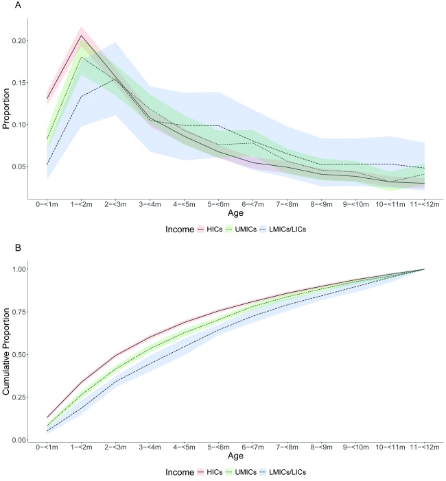 模型擬合的按國家收入水平分層的不同月齡時RSV住院的占比(A)及累積占比(B)