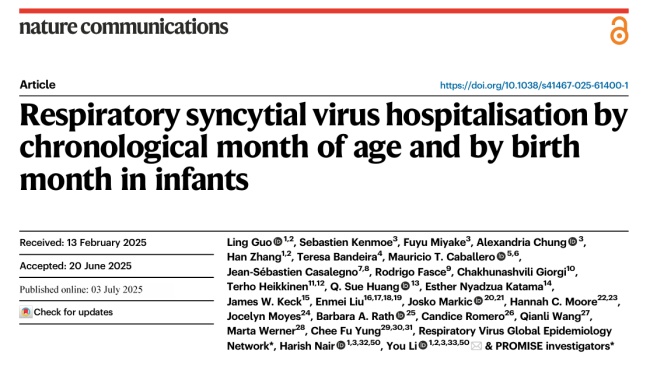 近日,公共衛(wèi)生學院李有教授課題組聯(lián)合國際呼吸道病毒全球流行病學網(wǎng)絡(luò)(Respiratory Virus Global Epidemiology Network, RSV GEN),在國際權(quán)威期刊《自然·通訊》(Nature Communications)發(fā)表題為《不同月齡及出生月份嬰兒的呼吸道合胞病毒住院負擔》(Respiratory syncytial virus hospitalisation by chronological month of age and by birth month in infants)的研究論文。該研究系統(tǒng)地分析了全球嬰兒呼吸道合胞病毒(Respiratory syncytial virus, RSV)住院的逐月年齡分布情況,結(jié)合不同地區(qū)RSV季節(jié)性流行數(shù)據(jù),開發(fā)并驗證了一套可預測不同出生月份嬰兒RSV住院風險分布的在線工具。