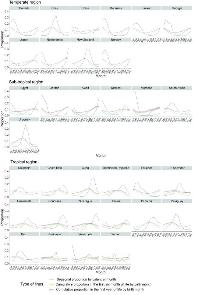 模型預測的不同國家、不同出生月份嬰兒0-<6月齡期間及1歲內(nèi)RSV住院的累積占比以及實際觀測的季節(jié)性分布