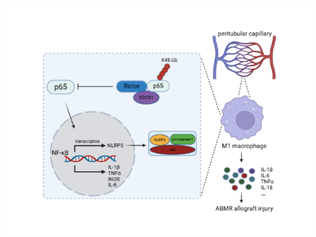 腎移植是終末期腎病患者有效延長生命、改善生活質(zhì)量的重要手段。然而,ABMR作為腎移植術(shù)后免疫相關(guān)移植物失功的主要原因,其發(fā)病率隨時間推移逐漸上升。早期巨噬細胞浸潤預(yù)示著不良的移植物結(jié)局,但其潛在機制尚未闡明。該團隊發(fā)現(xiàn)臨床ABMR患者的穿刺活檢標(biāo)本中M1型巨噬細胞極化和巨噬細胞中Rictor顯著上調(diào),且與移植腎損傷程度呈正相關(guān),利用Cre-Loxp系統(tǒng)構(gòu)建了巨噬細胞誘導(dǎo)性Rictor缺陷小鼠,并發(fā)現(xiàn)巨噬細胞中Rictor的特異性敲除通過促進ABMR移植腎中M1型巨噬細胞極化,加重了移植腎損傷,從而縮短了移植腎存活時間。機制上,Rictor通過上調(diào)E3泛素連接酶SOCS1靶向K48連接的p65泛素化降解,抑制NLRP3的轉(zhuǎn)錄水平及炎癥小體激活,為腎移植術(shù)后ABMR提供了潛在的治療策略。