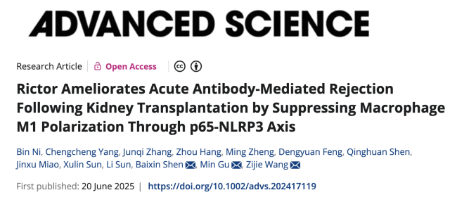 近日,我校第二附屬醫(yī)院顧民教授團隊在中科院一區(qū)雜志《Advanced Science》發(fā)表題為“Rictor Ameliorates Acute Antibody-Mediated Rejection Following Kidney Transplantation by Suppressing Macrophage M1 Polarization Through p65-NLRP3 Axis”的研究論文。該研究發(fā)現(xiàn)巨噬細胞活化在腎移植術(shù)后抗體介導(dǎo)排斥反應(yīng)(ABMR)移植腎局部免疫微環(huán)境中發(fā)揮重要作用,而Rictor/mTORC2信號通路有助于抑制M1型巨噬細胞極化,減輕移植腎組織學(xué)損傷,延長移植腎存活時間,該研究為腎移植術(shù)后ABMR的細胞療法提供了新思路。