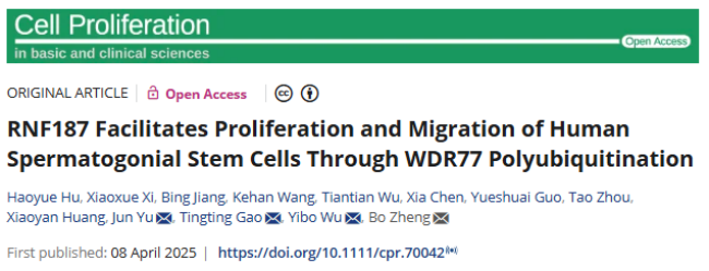 近日,我校姑蘇學院鄭波副研究員在《細胞增殖》(Cell Proliferation)期刊發表題為“RNF187通過WDR77多聚泛素化促進人精原干細胞增殖與遷移(RNF187 Facilitates Proliferation and Migration of Human Spermatogonial Stem Cells Through WDR77 Polyubiquitination)”的研究論文,揭示了蛋白質泛素化修飾調節人類精原干細胞命運決定的關鍵機制,為理解男性不育的病因提供了新見解。