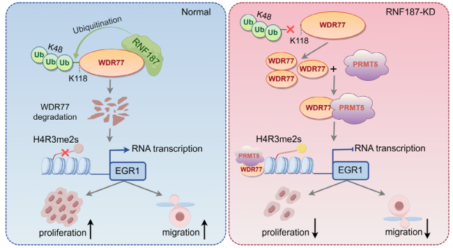 機制研究發現,RNF187通過賴氨酸48型(K48)連接的多聚泛素化修飾特異性識別WDR77的K118位點,并介導其經泛素-蛋白酶體系統(UPS)降解。進一步研究發現,WDR77表達下調導致其互作蛋白——精氨酸甲基轉移酶PRMT5催化的組蛋白H4第3位精氨酸對稱二甲基化修飾(H4R3me2s)水平降低,進而解除對早期生長反應蛋白1(EGR1)的轉錄抑制。EGR1作為維持人SSCs功能的正向調控因子,其表達激活對干細胞穩態至關重要。