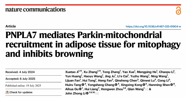 近日,我校基礎(chǔ)醫(yī)學(xué)院江蘇省代謝性疾病分子靶標(biāo)與干預(yù)重點(diǎn)實(shí)驗(yàn)室主任李仲教授課題組在《自然·通訊》(Nature Communications)在線發(fā)表了題為《PNPLA7 mediates Parkin-mitochondrial recruitment in adipose tissue for mitophagy and inhibits browning》的論文,研究發(fā)現(xiàn)在白色脂肪組織中PNPLA7能夠通過(guò)與Parkin相互作用抑制PKA對(duì)Parkin的磷酸化,增加Parkin的線粒體轉(zhuǎn)位,促進(jìn)線粒體自噬,從而減少白色脂肪棕色化。敲除白色脂肪組織中的PNPLA7,能夠減少Parkin的線粒體轉(zhuǎn)位、抑制線粒體自噬、促進(jìn)白色脂肪組織棕色化,闡明了冷刺激條件下,白色脂肪棕色化過(guò)程中線粒體自噬調(diào)控的新機(jī)制。