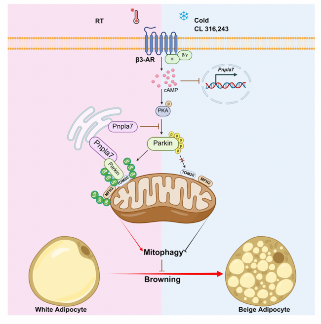 在寒冷刺激過(guò)程中,線粒體自噬在棕色和米色脂肪細(xì)胞的線粒體穩(wěn)態(tài)中發(fā)揮著關(guān)鍵作用。PINK1/Parkin介導(dǎo)的線粒體自噬是一種被廣泛研究的泛素依賴的線粒體自噬途徑。研究表明,在腹股溝白色脂肪組織(iWAT)棕色化過(guò)程中,Parkin介導(dǎo)的線粒體自噬受到抑制,特異性敲除脂肪組織中 Parkin可通過(guò)調(diào)節(jié)白色脂肪細(xì)胞中的線粒體自噬與線粒體的生物合成,抵御高脂飲食和衰老誘導(dǎo)的肥胖。此外,去甲腎上腺素在激活 β3腎上腺素受體(β3-AR)后,可以通過(guò) PKA 促進(jìn)Parkin發(fā)生磷酸進(jìn)化,抑制線粒體自噬并促進(jìn)白色脂肪組織的棕色化,但具體的分子機(jī)制尚不完全清楚。本研究通過(guò)構(gòu)建多個(gè)小鼠模型首次揭示了PNPLA7蛋白作為一個(gè)線粒體-內(nèi)質(zhì)網(wǎng)相關(guān)膜蛋白,通過(guò)調(diào)節(jié)白色脂肪組織中的線粒體自噬,在維持白色脂肪組織能量穩(wěn)態(tài)和棕色化過(guò)程中發(fā)揮關(guān)鍵作用。該研究鑒定了線粒體自噬和白色脂肪棕色化過(guò)程中新的關(guān)鍵調(diào)控因子,為代謝性疾病的治療提供了新的理論依據(jù)和策略。