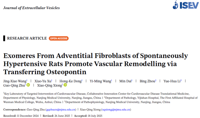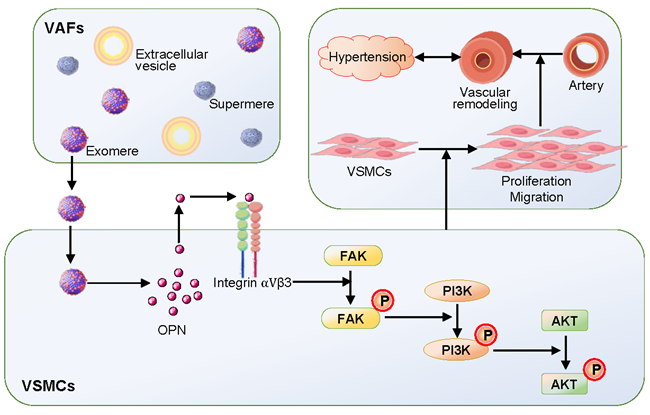 近日,基礎醫學院生理學系心血管實驗室朱國慶教授團隊在《細胞外囊泡雜志》(Journal of Extracellular Vesicles)發表了題為《自發性高血壓大鼠外膜成纖維細胞來源的外泌顆粒通過轉運骨橋蛋白促進血管重構》(Exomeres from adventitial fibroblasts of spontaneously hypertensive rats promote vascular remodelling via transferring osteopontin)的研究論文,發現自發性高血壓大鼠的血管外膜成纖維細胞釋放外泌顆粒(exomeres,EMs),通過轉運骨橋蛋白激活整合素αVβ3/FAK/PI3K/AKT信號通路,促進血管平滑肌細胞增殖和遷移,促進血管重構和加重高血壓,表明自發性高血壓大鼠的血管外膜成纖維細胞釋放的EMs在高血壓和血管重構中起重要作用,干預血管的骨橋蛋白和EMs可能是減輕高血壓血管重構的潛在治療策略。