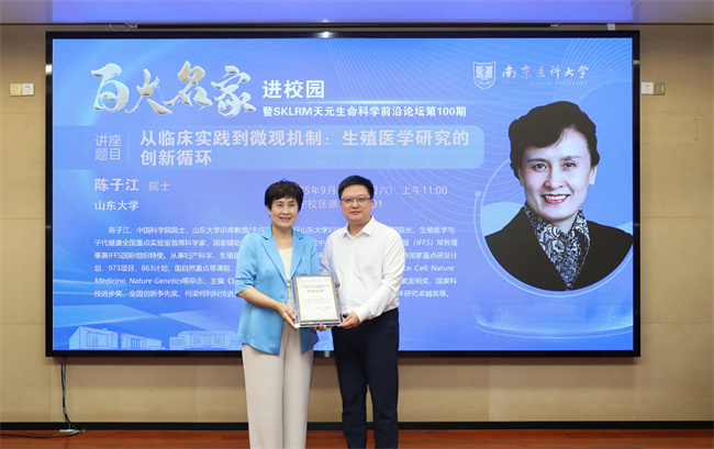 報告結(jié)束后,胡志斌校長為陳子江院士頒發(fā)榮譽證書,致敬其在生殖醫(yī)學領域的杰出貢獻,并衷心感謝她對實驗室發(fā)展的大力支持。隨后,由學生代表為陳院士獻上鮮花,現(xiàn)場再次響起了熱烈而持久的掌聲。