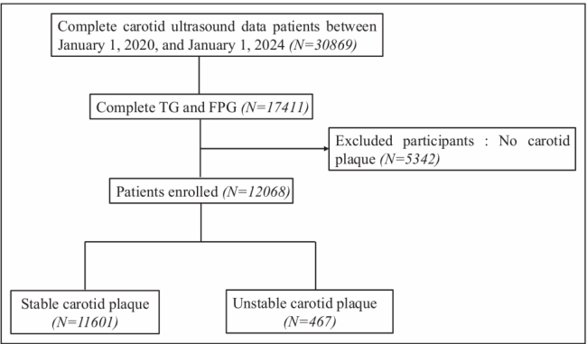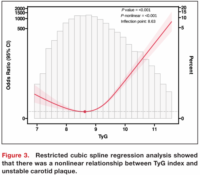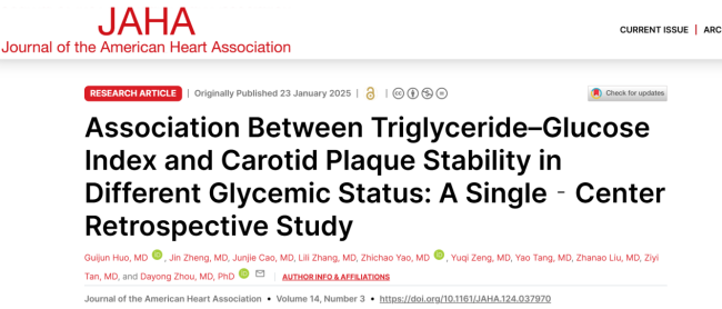 該團隊聚焦于一個反映胰島素抵抗的指標——甘油三酯-葡萄糖指數(TyG),在《美國心臟協會雜志》(Journal of the American Heart Association)期刊發表題為“不同血糖狀態下甘油三酯-葡萄糖指數與頸動脈斑塊穩定性的相關性:一項單中心回顧性研究(Association Between Triglyceride-Glucose Index and Carotid Plaque Stability in Different Glycemic Status: A Single-Center Retrospective Study)”的研究論文。