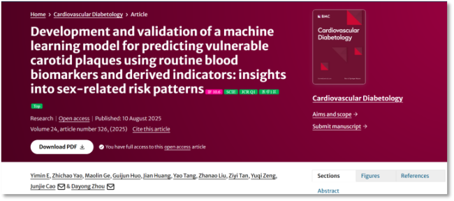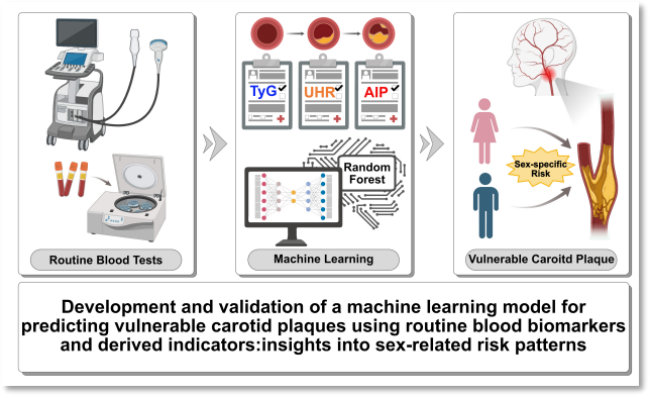 另一項研究在《心血管糖尿病學》(Cardiovascular Diabetology)期刊發表,題為“基于常規血液生物標志物及其衍生指標的頸動脈易損斑塊預測機器學習模型的建立與驗證:性別相關風險模式的啟示(Development and validation of a machine learning model for predicting vulnerable carotid plaques using routine blood biomarkers and derived indicators: insights into sex-related risk patterns)”。