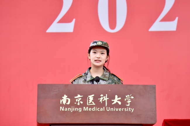 基礎醫學院2025級新生李雨凡代表軍訓新生發言,分享了軍訓中錘煉意志、精進救護技能的感悟與成長。