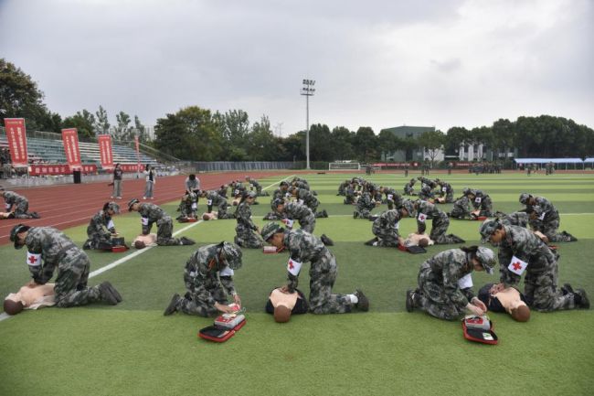在軍訓成果匯報環節,參訓學生進行了匕首操、格斗術、應急救護等科目,并將軍事技能訓練大綱要求與醫學院校特色相結合,展示了模擬戰場環境下的實戰化救護操作,新生們熟練完成心肺復蘇、創傷包扎、傷員轉移等內容,凸顯“守護生命、‘救’在校園”的訓練成效。