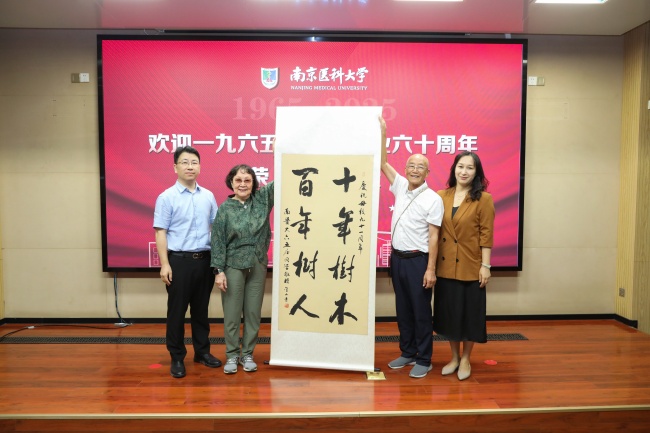 老校友們向母校贈送了“十年樹木、百年樹人”的墨寶,八字箴言筆力遒勁,既是對母校育人事業的贊美,也凝聚著校友們對母校的深厚情誼。