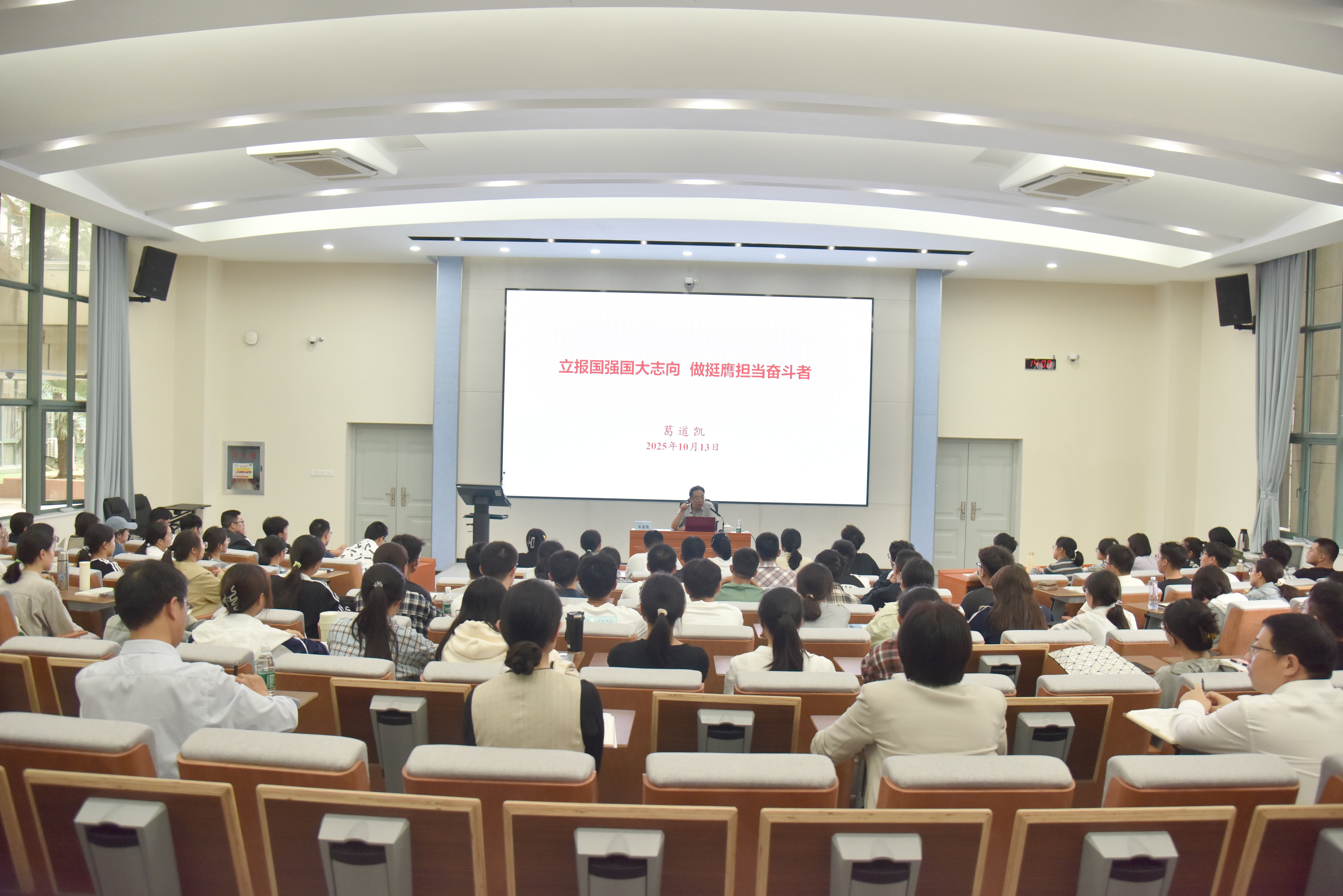 葛道凱主任以《立報國強國大志向 做挺膺擔當奮斗者》為題,回顧了中國共產黨教育方針的百年發展,指出教育工作的根本出發點和落腳點在于為黨的中心工作服務,中國共產黨在領導中國人民進行革命、建設和改革的偉大實踐中,始終高度重視教育事業,始終積極發展教育事業,始終充分發揮教育作用,取得歷史性成就、發生格局性變化,譜寫最輝煌篇章。專題思政課通過豐富的案例故事和詳實的數據圖表,充分展現了我國從教育弱國走向教育大國、從教育大國邁向教育強國的發展成就。