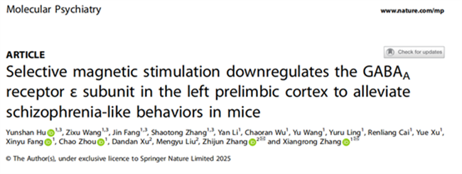 近日,我校附屬腦科院張向榮教授課題組在國際精神病學權威期刊《分子精神病學》(Molecular Psychiatry)在線發(fā)表題為《選擇性磁刺激下調左前邊緣皮質中的GABAA受體ε亞基緩解小鼠精神分裂癥樣行為》(Selective magnetic stimulation downregulates the GABAA receptor ε subunit in the left prelimbic cortex to alleviate schizophrenia-like behaviors in mice)的研究論文。該研究在精神分裂癥模型小鼠中運用了超順磁納米顆粒(SPIO)介導的聯(lián)合磁刺激系統(tǒng)治療(c-MSST),首次實現(xiàn)前邊緣皮層(PrL)的高效精準靶向激活,并揭示配體門控氯離子通道GABAA受體ε亞基(GABRE)是磁刺激改善小鼠精神分裂癥樣行為的核心分子機制,為精神分裂癥的物理治療提供了新策略和新靶點。