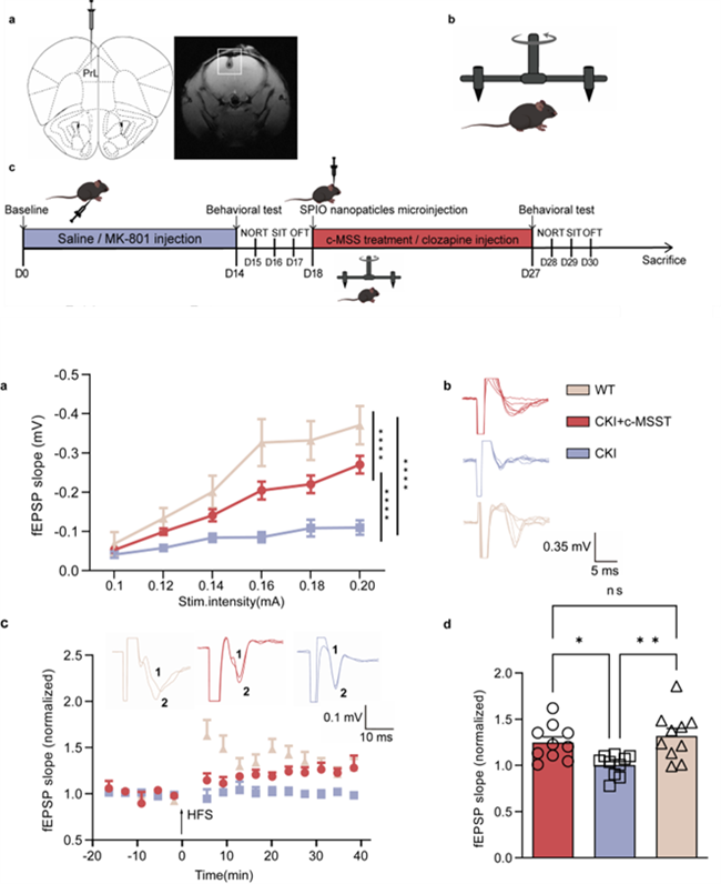 該研究首次成功應用c-MSST干預體系,實現(xiàn)對SCZ關鍵腦區(qū)PrL的精準靶向磁刺激,創(chuàng)新性地揭示GABAA受體ε亞基(GABRE)作為核心分子靶點的調控機制:c-MSST通過上調p62/SQSTM1蛋白,隔離GABARAP家族分子從而減少GABRE膜表達,進而逆轉MK-801引起的突觸可塑性損傷,最終改善SCZ樣行為。針對SCZ模型小鼠的研究表明,c-MSST靶向干預左側PrL逆轉其社交、認知、運動受損,效果與經(jīng)典藥物氯氮平干預相當,為SCZ提供了全新的物理干預策略。