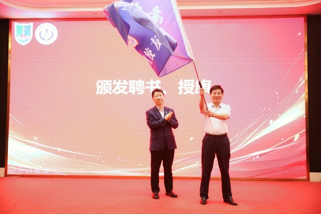 岳國峰副校長為新當選的揚州校友會理事會會長束余聲頒發聘書并授予會旗。