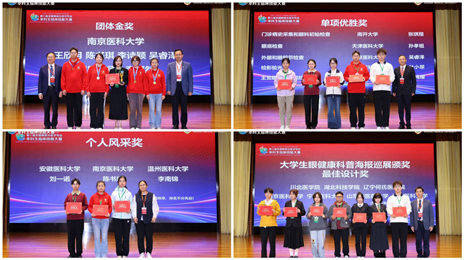 經過1天緊張激烈的角逐,比賽圓滿落下帷幕。大賽產生金獎3個、銀獎6個、銅獎12個。我校的學生團隊憑借出色的表現摘得金獎,并且總成績位列第一。我校第四臨床醫學院眼視光醫學專業學生王欣月、陳書琪、李詩穎、吳睿澤奪得金獎。在個人風采賽中,我校學子也展現了卓越的個人能力與專業素養,陳書琪同學榮獲個人風采獎、吳睿澤同學榮獲單項優勝獎。