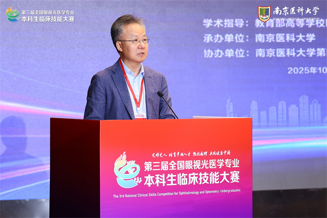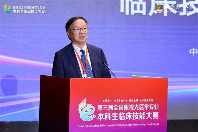 開幕式上,校黨委常委、副校長沈歷宗致歡迎辭,向參賽院校師生、賽事嘉賓表示熱烈的歡迎。他表示,南京醫科大學自2016年招收眼視光醫學專業以來,始終秉持“博學至精 明德至善”的校訓精神,深耕眼視光醫學教育沃土,致力于打造具有國際視野、創新精神和實踐能力的卓越人才,為推動我國眼視光醫學事業的發展不斷貢獻南醫智慧和力量。他強調,此次大賽不僅是對各高校教學成果的一次集中展示,更是學生臨床技能和綜合素質的全面檢閱,希望所有參賽選手能夠以賽促學、以賽促練,在互相交流與切磋中共同進步。